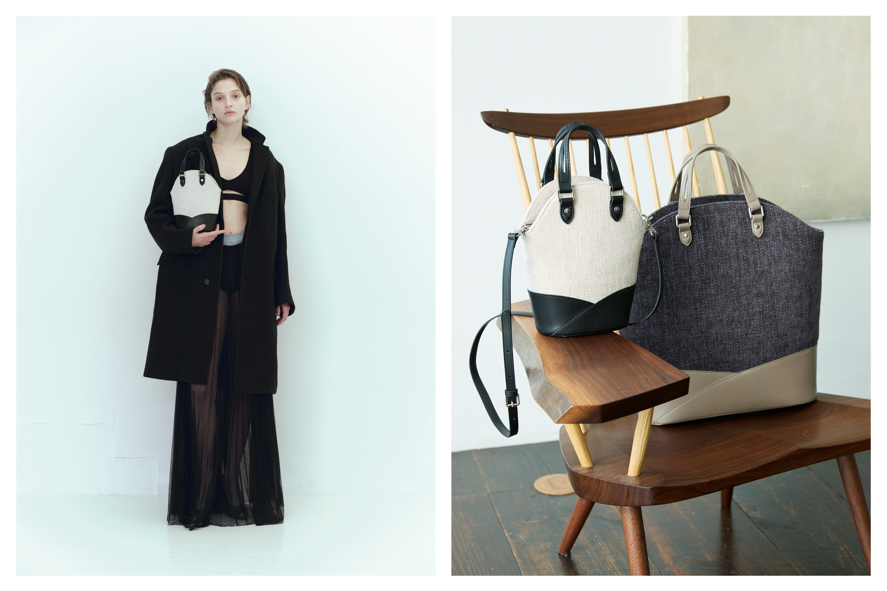 NO LA241047 PRICE ¥22,000+ Tax MATERIAL Interior Fabric×Cow Leather SIZE H17.0/W23.0/D6.0 COLOR Charcoal×Graige,Off White×Black -